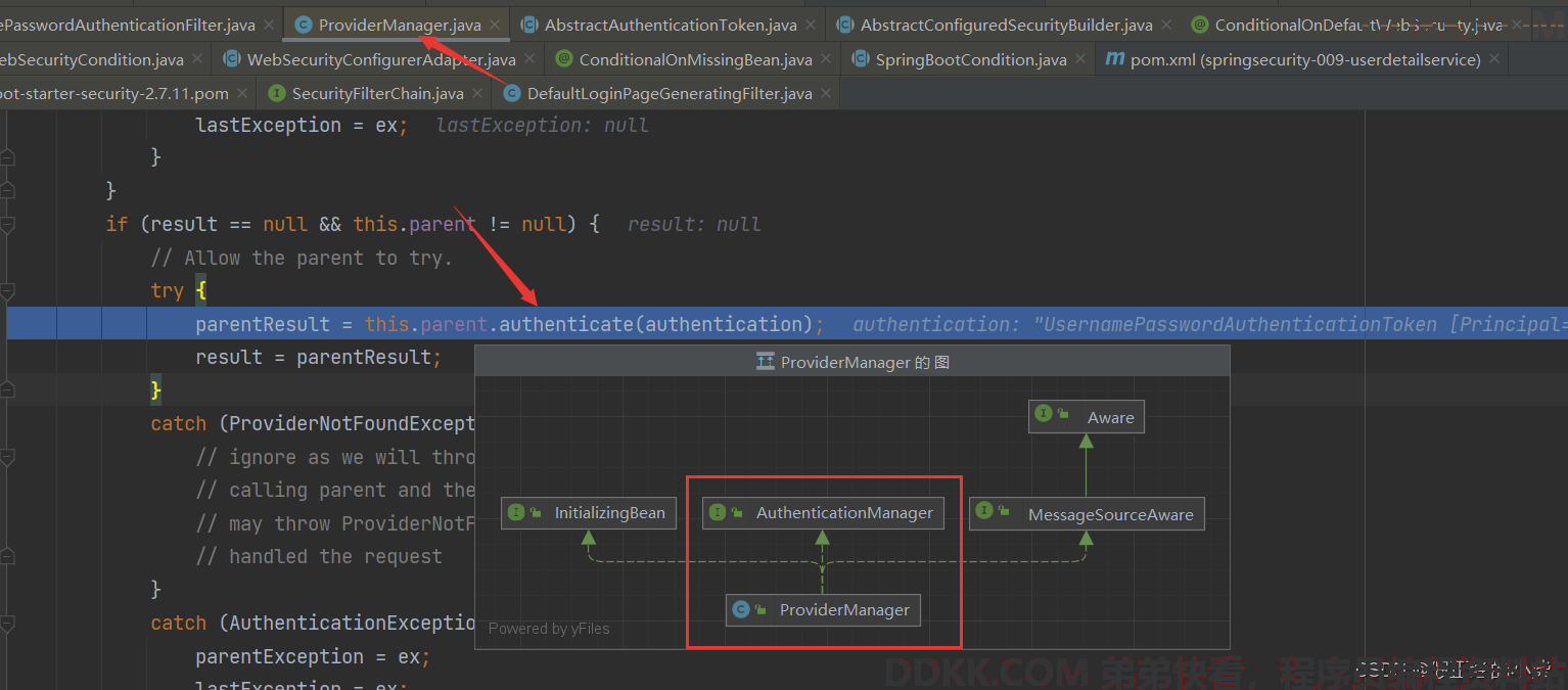 - 得知道 DaoAuthenticationProvider retrieveUser 方法和 additionalAuthenticationChecks 方法(这俩方法分别应用了UserDetailsService和PasswordEncoder对象)。UsernamePasswordAuthenticationFilter 最后也是去通过 ProviderManager 中的 authenticate 去认证,最后还是调到 DaoAuthenticationProvider 的父类 AbstractUserDetailsAuthenticationProvider 的 authenticate 去认证,我们得清楚这个流程和这些类、方法,方便后期需要以及调试可用。