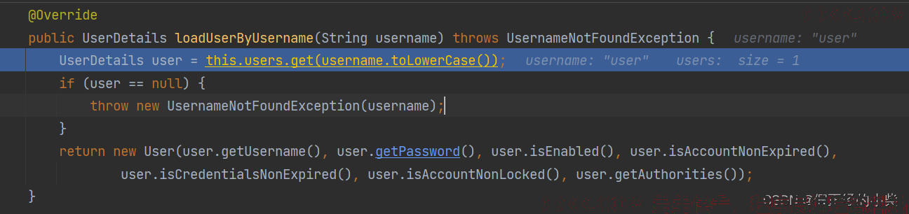 简单看看它里面的loadUserByUsername方法,写的也是非常简单,它这里面用户名不区分大小写。