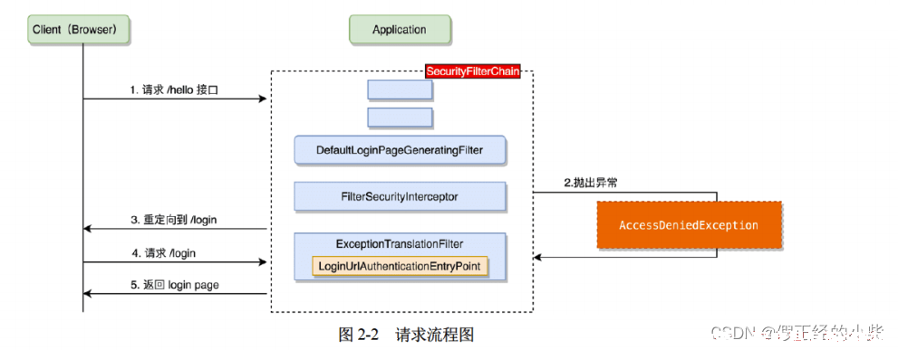 3. 抛出 AccessDeniedException 的异常会被 ExceptionTranslationFilter 捕获,这个Filter中会去调用 LoginUrlAuthenticationEntryPoint#commence 方法给客户端返回 302(暂时重定向),要求客户端进行重定向到 /login 页面。 4、 客户端发送/login请求;