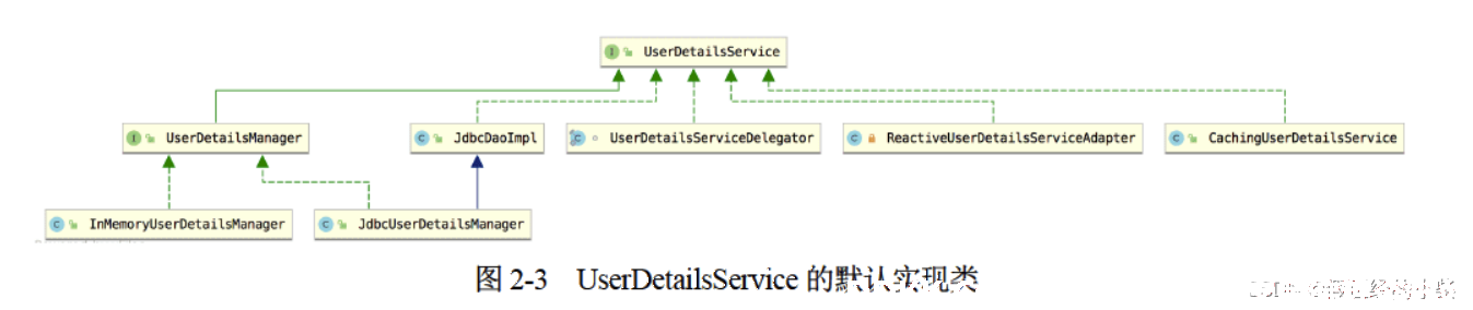 - JdbcUserDetailsManager 继承自 JdbcDaoImpl 同时又实现了 UserDetailsManager 接口,因此可以通过 JdbcUserDetailsManager 实现对用户的增删改查操作,这些操作都会持久化到数据库中。不过 JdbcUserDetailsManager 有一个局限性,就是操作数据库中用户的 SQL 都是提前写好的,不够灵活,因此在实际开发中 JdbcUserDetailsManager 使用并不多。