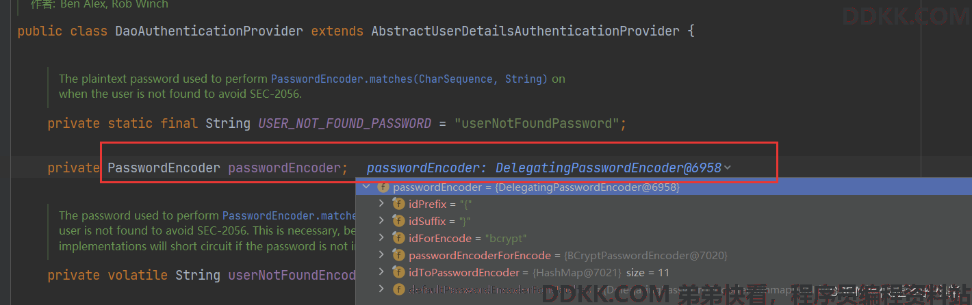 1、 再说说密码验证,密码验证在3源码里指出了,在获取UserDetails对象user后,会调用子类的additionalAuthenticationChecks方法进行密码验证主要就是和输出框输入的密码和那个UserDetails对象中的密码进行比较,UserDetails密码可以理解为是通过PasswordEncoder编码后的密码(密文),而输入框输入的是可以理解为是明文,可以简单这样先理解然后通过PasswordEncoder去看看是否匹配默认是DelegatingPasswordEncoder密码编码器;