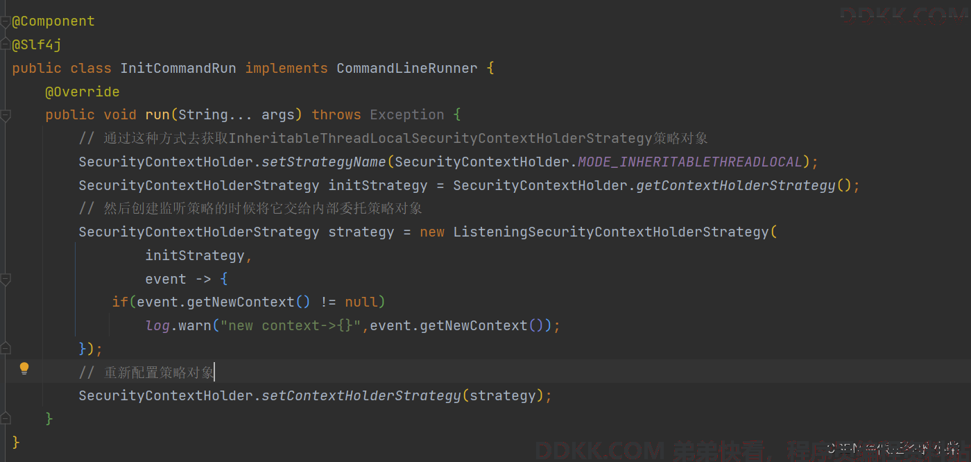 当使用ListeningSecurityContextHolderStrategy 时,可以向如下这样使用。当然它默认的执行策略是 ThreadLocalSecurity… ,所以当不需要换策略的话直接用监听器对象当构造参数构造即可,如果想切换成多线程,就像如下那样配置吧。