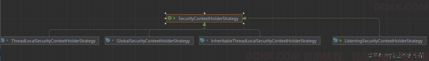 可以看见有一个 SecurityContextHolderStrategy 对象 strategy,它就是“算法的封装体”。SecurityContextHolderStrategy 是一个接口,下面是其源代码,比较简单。