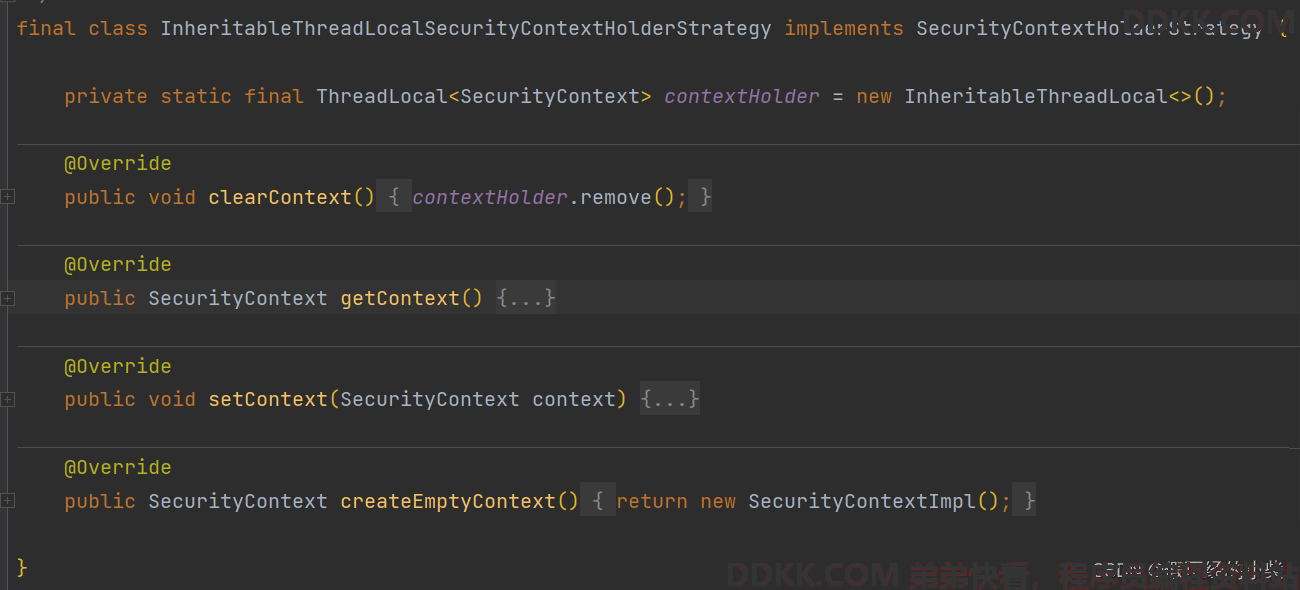 ThreadLocalSecurityContextHolderStrategy:存储数据的载体是一个 ThreadLocal,所以针对 SecurityContext 的清空、获取以及存储,都是在 ThreadLocal 中进行操作。源码过于简单,不分析了,自己看吧。