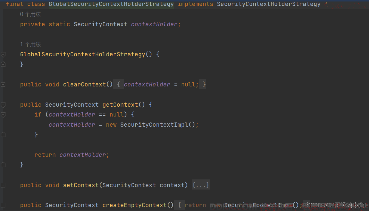 GlobalSecurityContextHolderStrategy:它实现起来就更更更简单了,直接用个静态变量保存 SecurityContext,所以多线程环境下它是可以使用了,但一般在web开发中,这肯定是使用的少的。