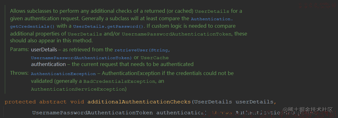 这是一个抽象方法,方法注释中说明了该方法的用处,允许子类使用userDetails做任何附加校验,如果需要实现自定义逻辑实现应该要重写该方法以提供认证。