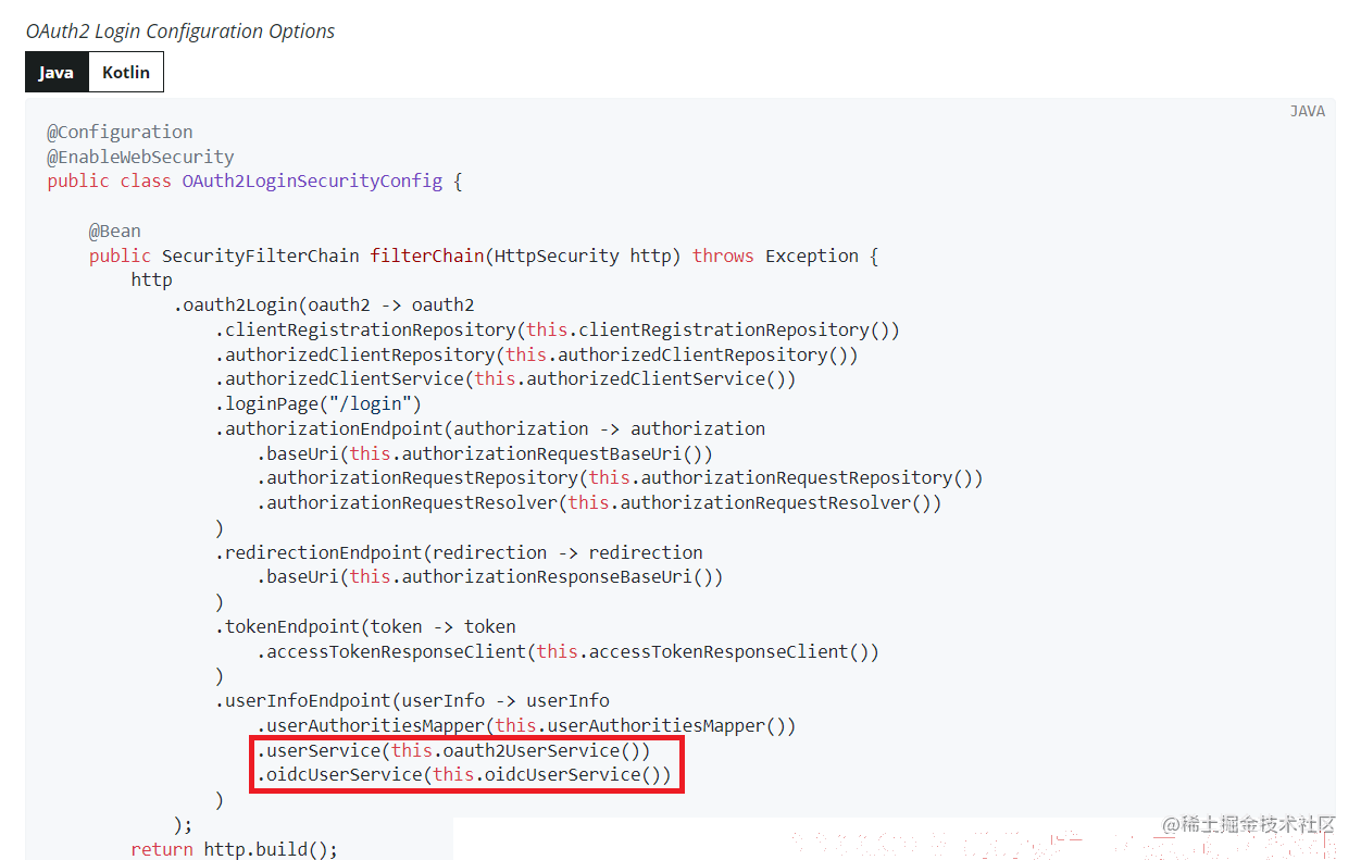 先来看一下文档,文档中说明了OAuth2 Login的一些配置,其中就有设置获取用户信息的服务,如下