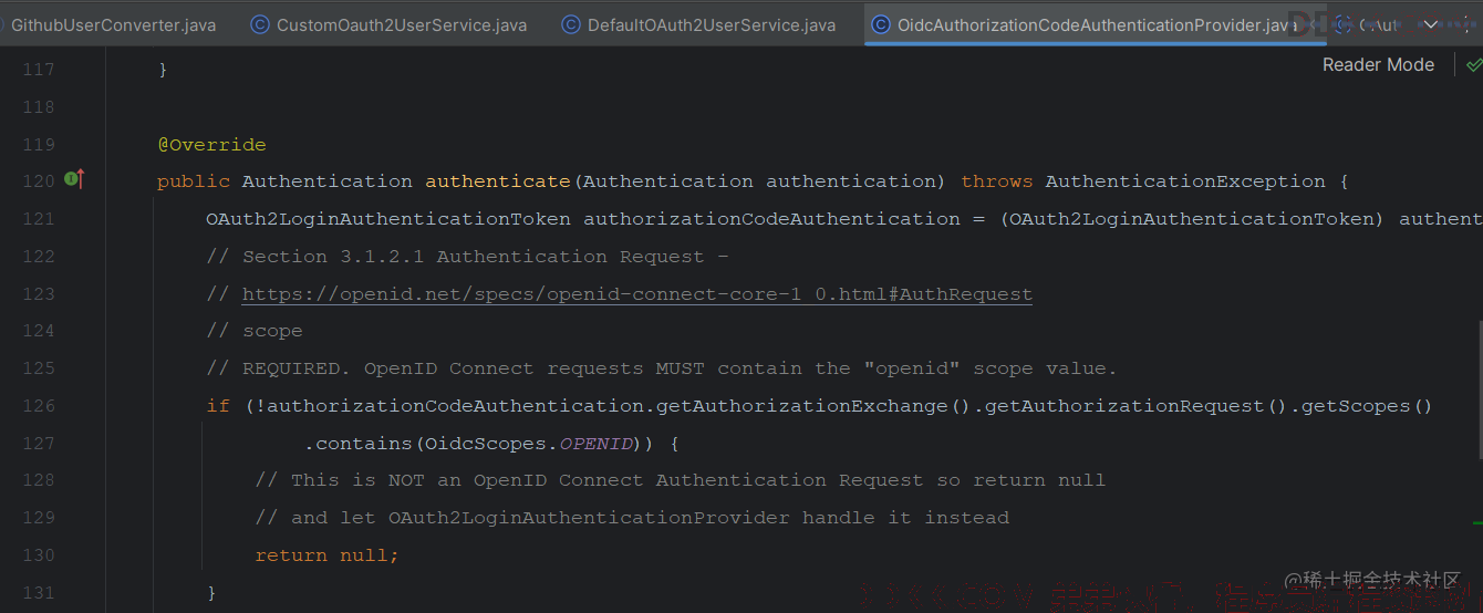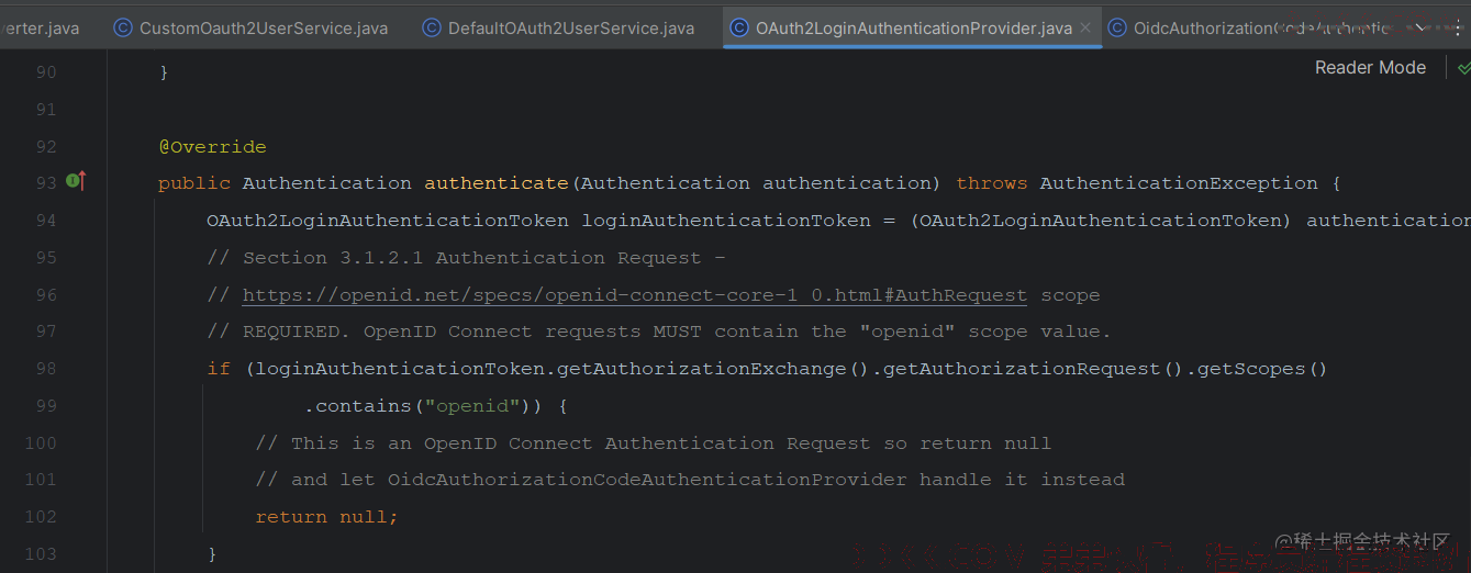 发现Oidc是需要有openid的scope才会被处理,而OAuth2开头的这个是在scope中未包含openid才会去处理。细看之后发现它们里边注入的OAuth2UserService的实例不一样,处理oidc登录的实例是OidcUserService,处理普通oauth登录的是DefaultOAuth2UserService,这是Security OAuth2 Client针对OAuth与OpenId connect两种登录方式的处理,在之前也有提到过,当scope中包含openid时本次就是openid connect登录,获取token后会响应idToken,里边包含了用户信息,所以这里会有两种处理。同理,如果我们要自定义这两个service的话也需要实现这两个service,提高兼容性。