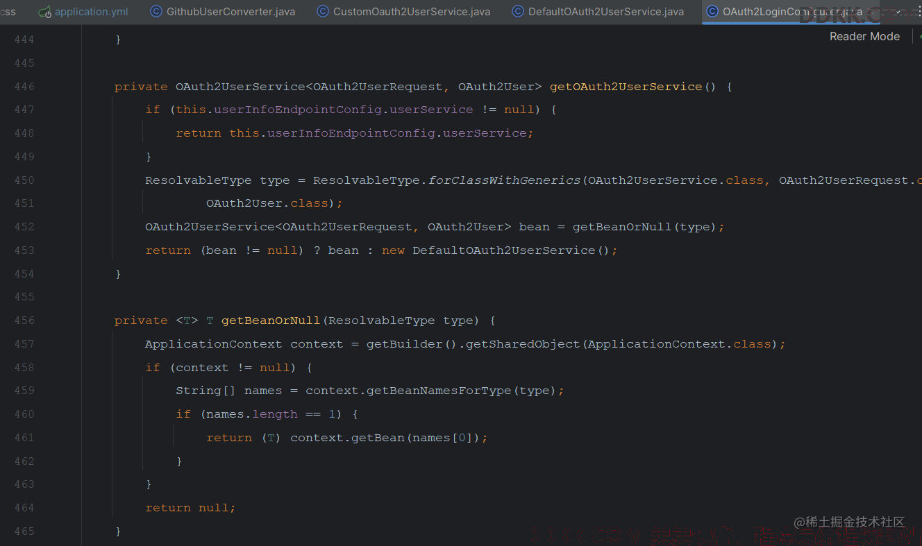 虽然上边说明了如何自定义OAuth2UserService,但是本人在查看源码时发现框架会先从配置中获取,获取不到会从ioc中获取,ioc中没有就初始化一个,如下所示
