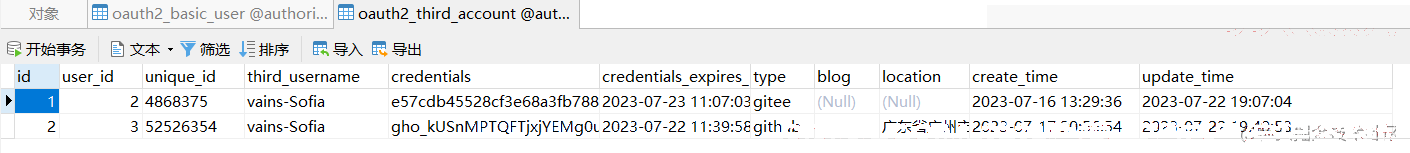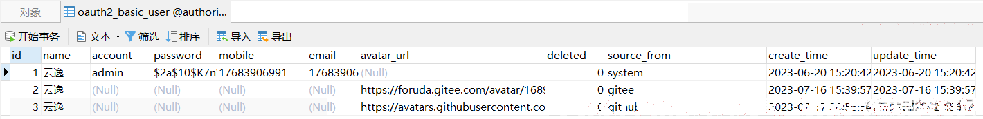 基础用户信息表(第一个云逸是手动添加的,剩下两个是因为Gitee和Github都是这个昵称)