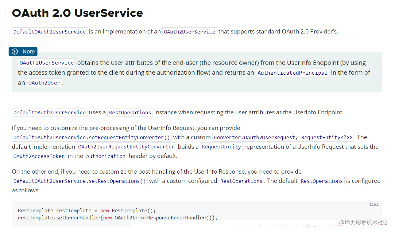 发现OAuth2UserService有一个默认实现DefaultOAuth2UserService,它是通过RestOperations的实例请求用户的基础信息,也说明了该类中可自定义的一些配置,例如请求参数转换、响应数据处理。