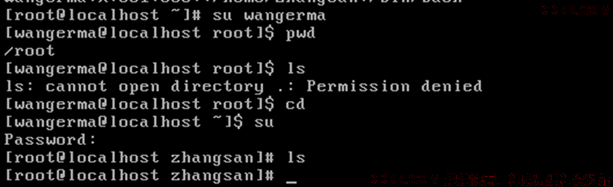 如:在/root目录下分别切换到root用户和wangerma用户,调用ls命令