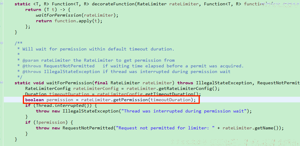RateLimiter最核心处是:获取permission。RateLimiter::getPermission,支持AtomicRateLimiter(令桶算法)和SemaphoreBasedRateLimiter(信号量机制)。默认使用AtomicRateLimiter(令桶算法)